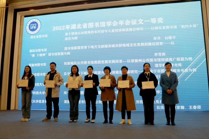 开幕式上,参会领导为中国图书馆学会2021年阅读推广展示项目、2021年湖北省全民阅读示范基地、2021年湖北省阅读推广示范项目以及2022年湖北省图书馆学会年会征文一等奖作者颁奖。征文一等奖7篇,作者分别来自湖北省图书馆、襄阳市图书馆、恩施州图书馆、咸宁市图书馆、华中科技大学图书馆和武汉大学信息管理学院。
