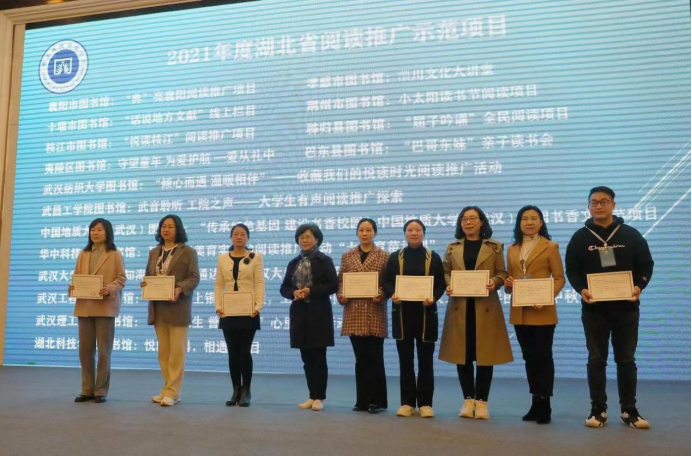 阅读推广示范项目16个,包括襄阳市图书馆“典”亮襄阳阅读推广项目、孝感市图书馆澴川文化大讲堂、十堰市图书馆“话说地方文献”线上栏目、荆州市图书馆小太阳读书节阅读项目、枝江市图书馆“悦读枝江”阅读推广项目、秭归县图书馆“屈子吟诵”全民阅读项目、夷陵区图书馆“守望童年为爱护航”项目、巴东县图书馆“巴哥东妹”亲子读书会以及武汉纺织大学图书馆、武昌工学院图书馆、中国地质大学(武汉)图书馆、华中科技大学图书馆、武汉大学图书馆、武汉工程大学图书馆、武汉理工大学图书馆、湖北科技学院图书馆等高校图书馆项目。