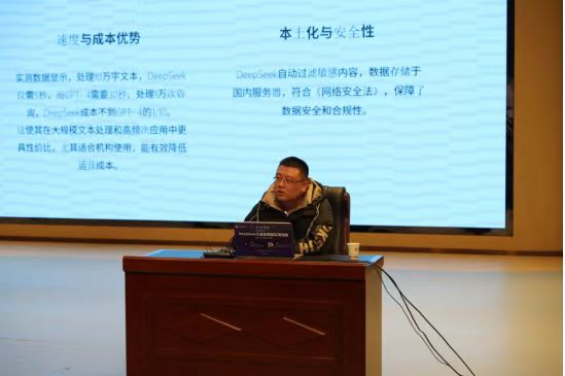 此场讲座由襄阳职业技术学院人工智能技术应用专业研究室团队负责人陈超博士和湖北省“技术能手”代颖副教授主讲,讲座聚焦“智能时代的信息助手:DeepSeek大语言模型实用技能”,从人工智能技术演进与核心功能、实战应用与效率提升、长效赋能智慧服务三个方面深入浅出地介绍了DeepSeek的技术原理、发展历程以及在各个领域的应用前景,最后通过生动案例直观展示了DeepSeek应用技巧和方法。