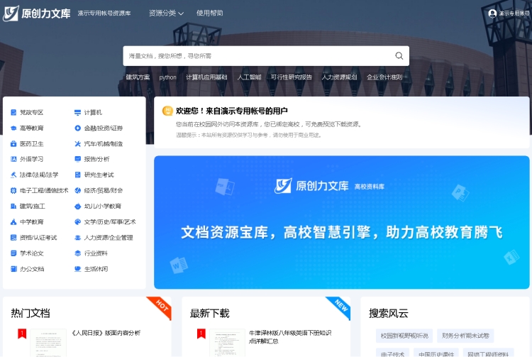原创力文库高校版系专门面向高校师生构建的资料库。站内资源量逾4+亿,提供506个子分类,经由精细的数据筛选与匹配流程,汇聚了主流大学学科资料、备考资源、行政事务文件、就业以及行业资料等多方面内容。由此打造出服务于高校师生的专业版资源库,可充分满足师生对于学习资料、考试辅导、备课素材以及办公文档等各类需求。