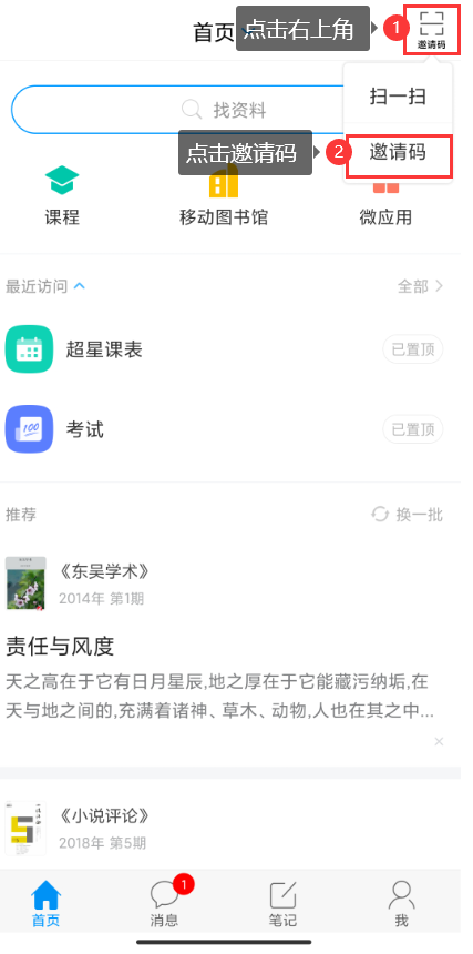 4.点击右上角“邀请码”,选择邀请码 5.邀请码详见超星“学习通”操作手册。