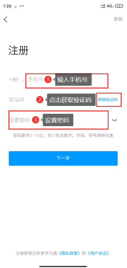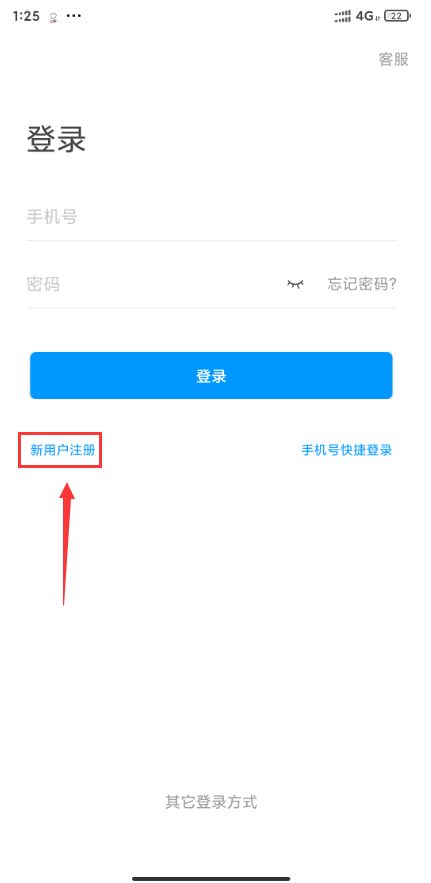 2.点击“新用户注册” 3.输入手机号,获取验证码,设置密码。完成注册。